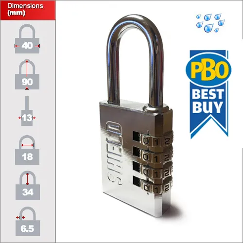 We have a 40mm and a 50mm version of this lock with 4 dials and 5 dials respectively. The 50mm is quite a chunky and heavy lock since it is made from solid brass with Shield's special triple chrome plated finish.