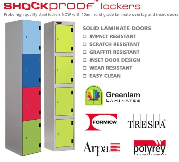 Steel bodied lockers supplied with a solid grade 10mm laminate door. The solid grade laminate is SHOCKPROOF, impact resistant, scratch resistant, moisture resistant, graffiti resistant, wear resistant and easy clean.